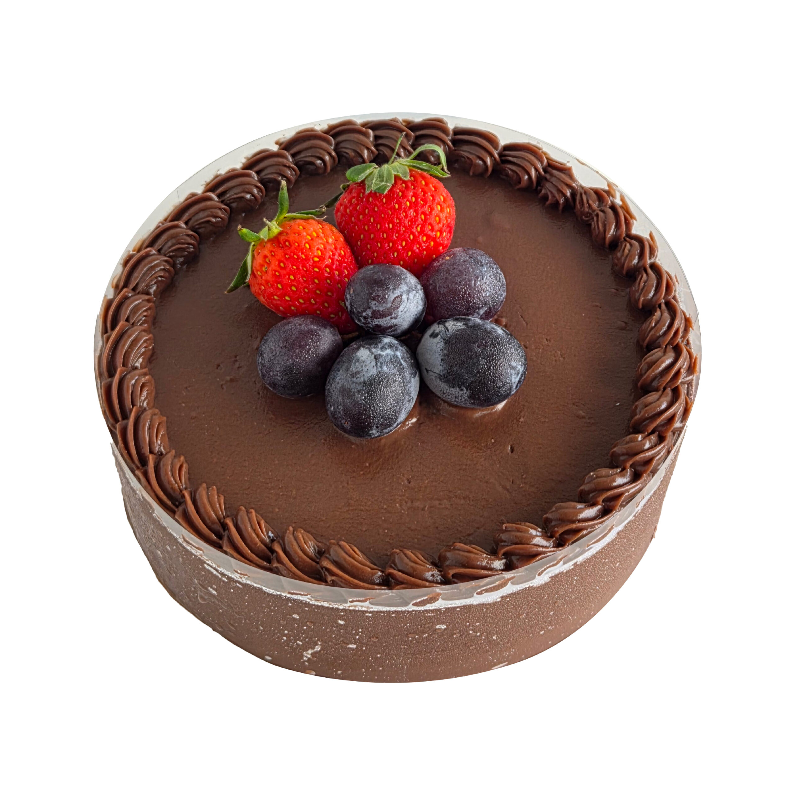 A rich and indulgent cake made with moist chocolate sponge layered with smooth chocolate fudge cream, finished with a silky chocolate topping and garnished with fresh strawberries and grapes